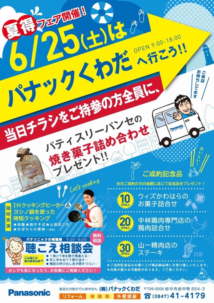この度、当店にて「夏得フェア」を開催させていただきます!! 当日は補聴器の体験ができる「聴こえ相談会」やヨシノなべさんによる「IH料理教室」も実施致します✨ また「ご来場記念品」や「ご成約記念品」として地元府中市のお店の逸品を準備しております(^^)/ 梅雨のじめじめした時期に入りますが、是非ともご来場していただき楽しんでいただければ幸いです♪ スタッフ一同心よりお待ちしております(≧▽≦)