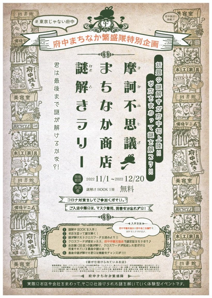 続いて「府中まちなか繁盛隊」からのイベントのお知らせです♪ 話題の謎解きラリーが府中初上陸!! お店を回って謎を解こう!! 開催期間は11月1日~12月20日まで ※参加費無料 参加店舗36店に提示してある謎を全て解いた方には豪華賞品が当たるチャンス✨ 当店も参加しておりますので謎が提示してありますよ(*^▽^*) 皆様のご来店お待ちしております(^^)/