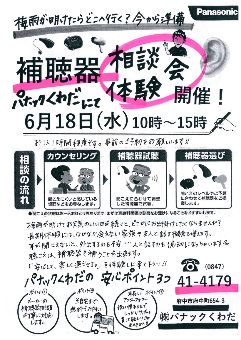 補聴器の相談、試聴、フィッティング、アフターフォローまでメーカーの専門相談員と当店スタッフが丁寧に対応いたします!