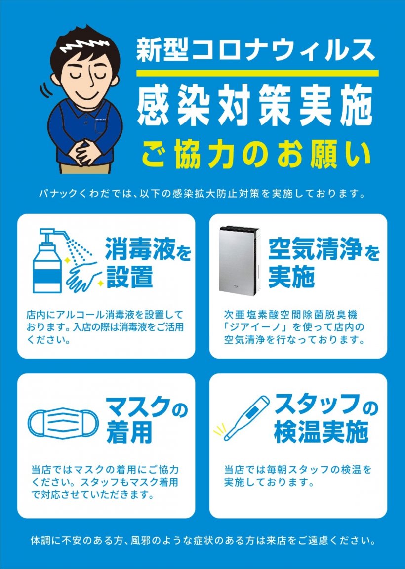 当店では新型コロナウイルス感染症対策を実施しております! 皆様に笑顔になっていただけるような接客を心がけておりますので、いつでもお気軽にご来店ください♪