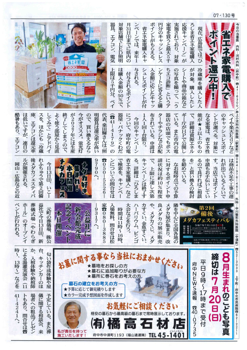 ”省エネ家電購入”でポイント還元中!! 現在、広島県では「ひろしま省エネ家電購入応援キャンペーン」が実施されており、対象家電を買うと、最大5千円分のキャッシュレスポイントがもらえます! なんと、そのPR取材として当店が記事に掲載されました♪♪♪ 当店では商品の最適な提案や設置工事はもちろん、ポイント申請もお手伝いさせていただいております! この機会に是非、お気軽に買い替えのご相談をしていただければと思います!